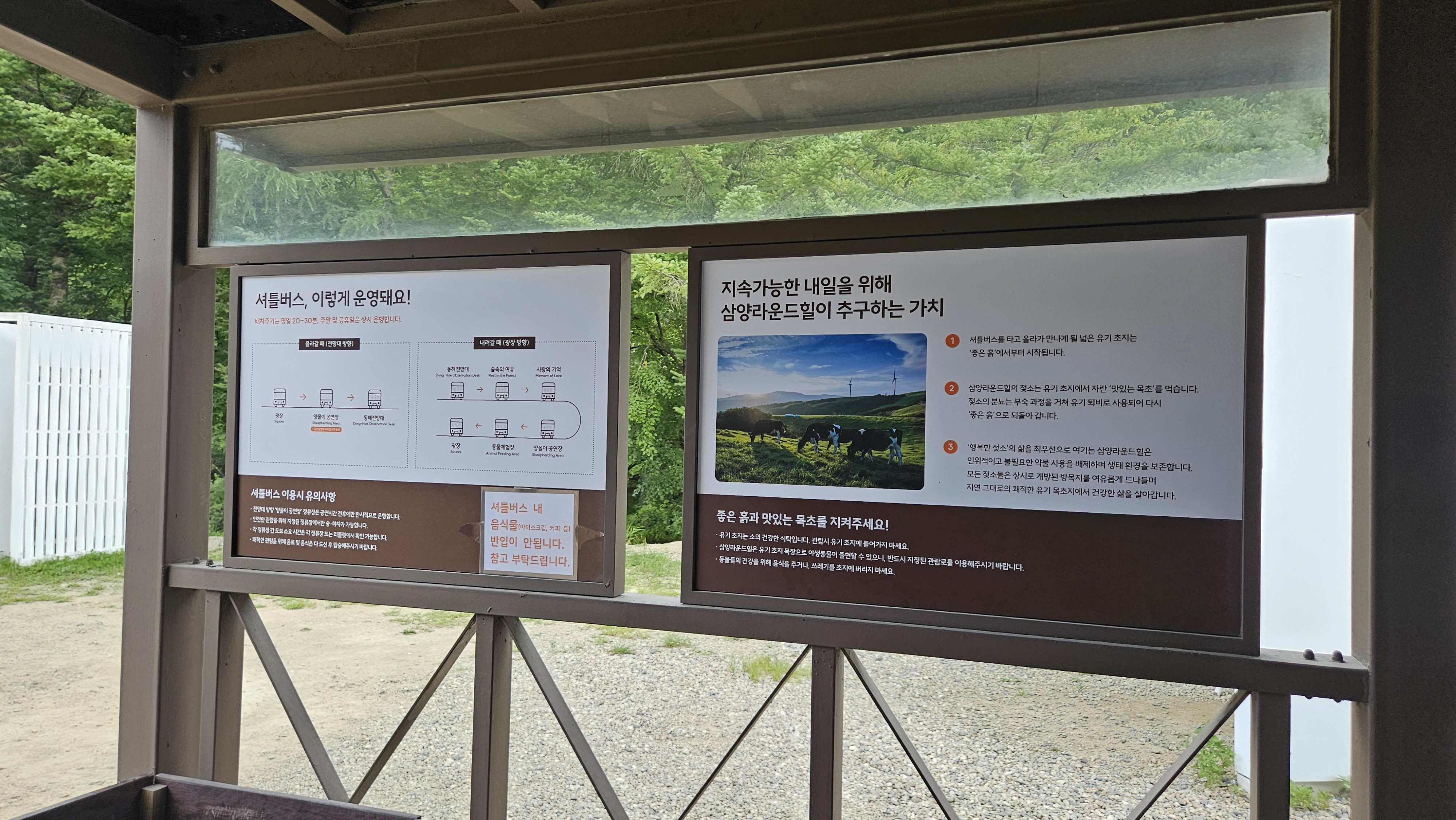 입장료는 대인 12,000원, 소인 10,000원이고, 36개월 미만 아기와 평창군민, 생활보호대상자인 학생들은 무료 입장이 가능합니다. 저는 광장 주차장에 차를 대고 매표소에서 표를 받은 뒤, 약 3분 정도 걸어 올라가 버스정류장으로 이동했습니다. 정류장에서 셔틀버스를 타면 양몰이 공연장과 동해전망대까지 올라갈 수 있는데, 버스 노선이 알차게 구성되어 있어 편리했습니다. 내려올 때는 숲속의 여유, 사랑의 기억, 동물체험장 같은 포인트에서 정차해 주더군요.
