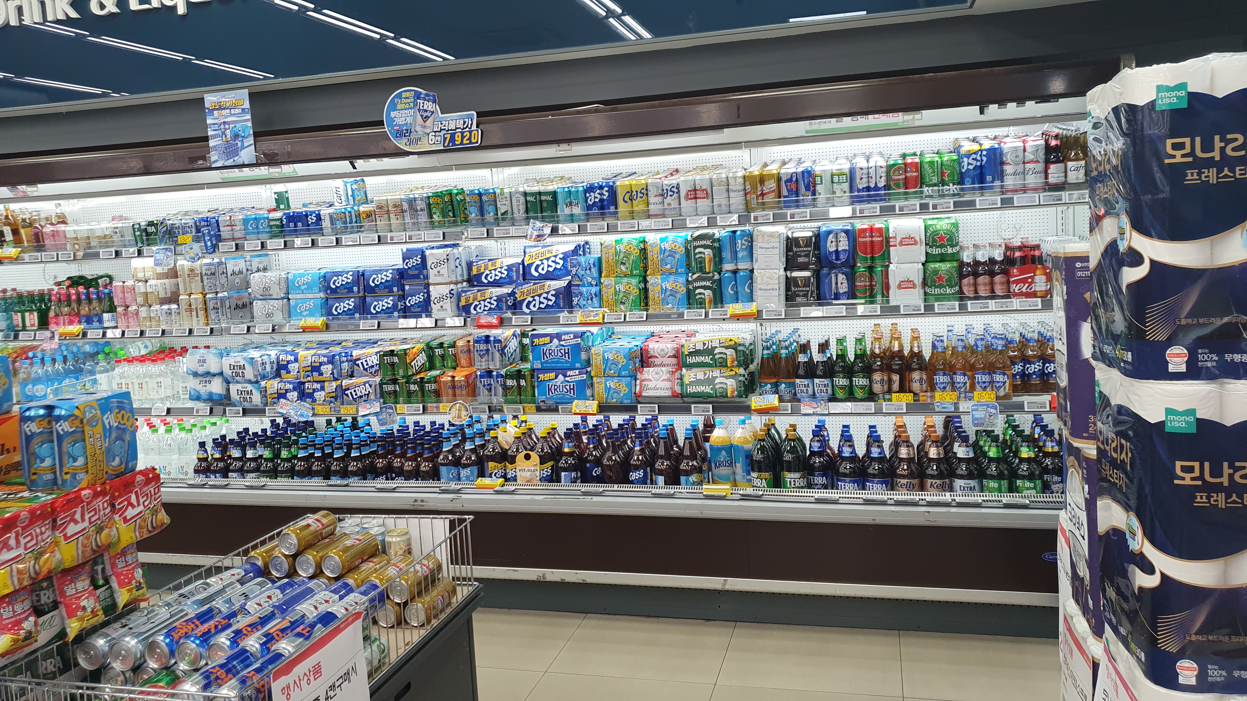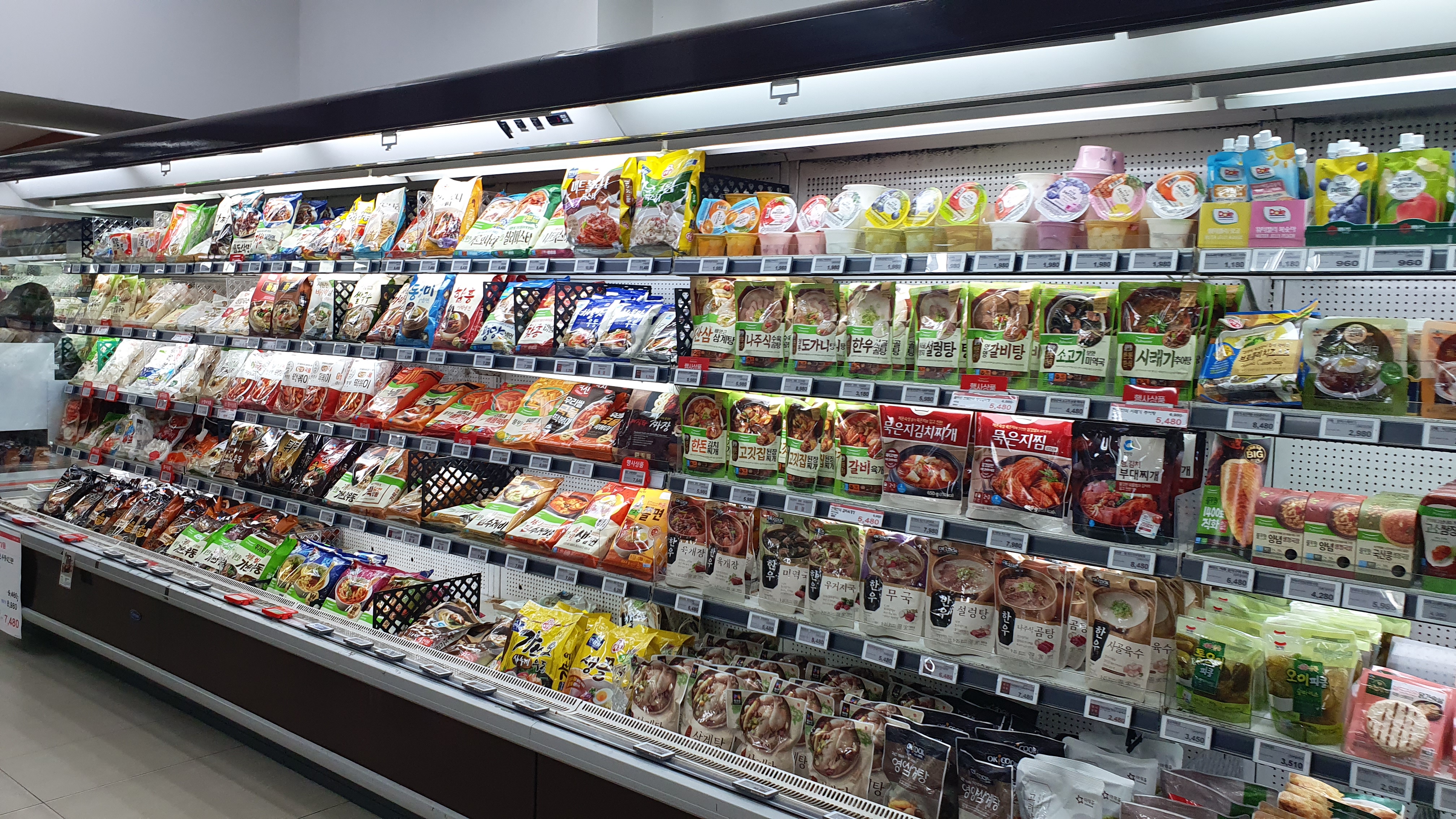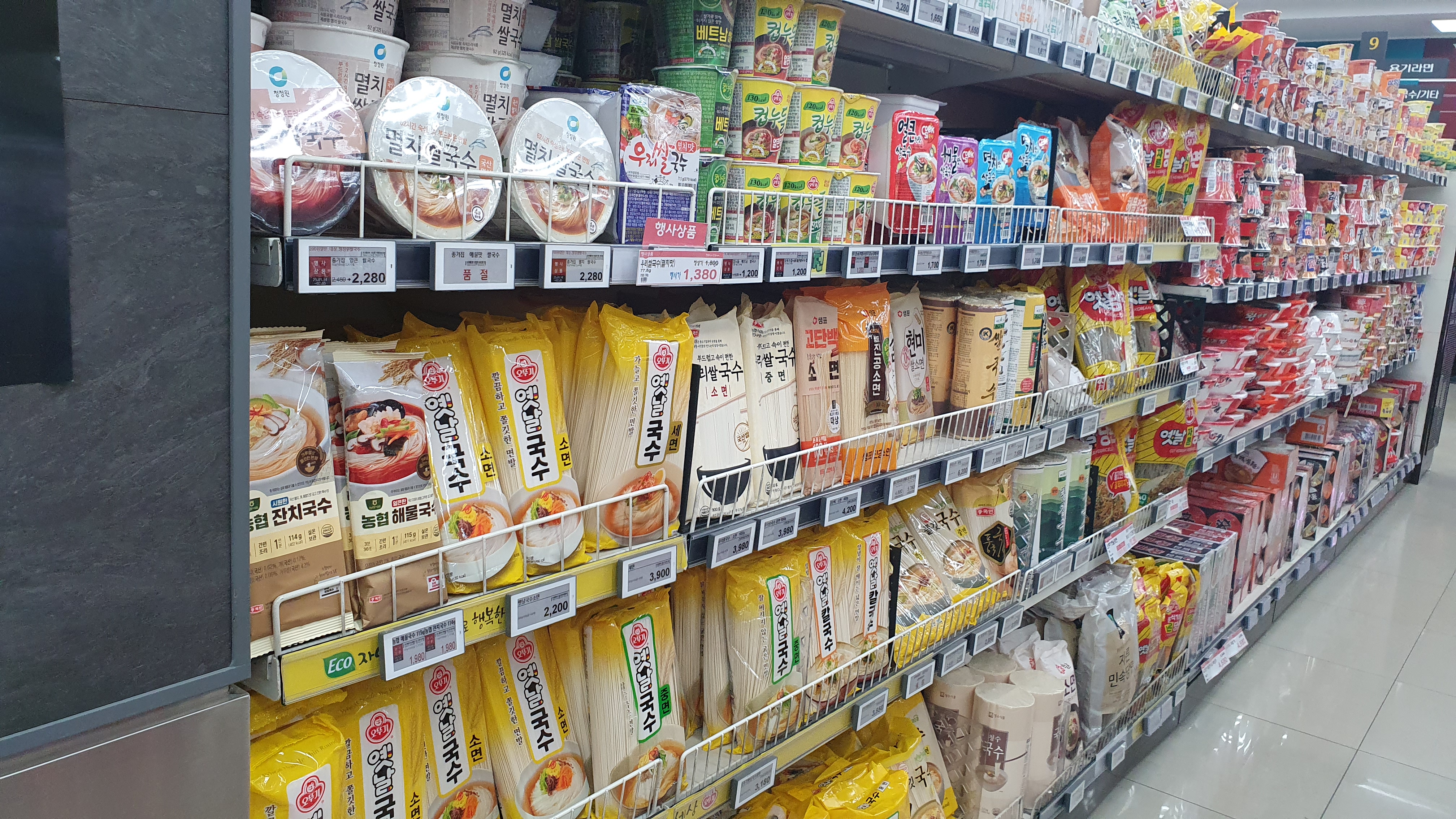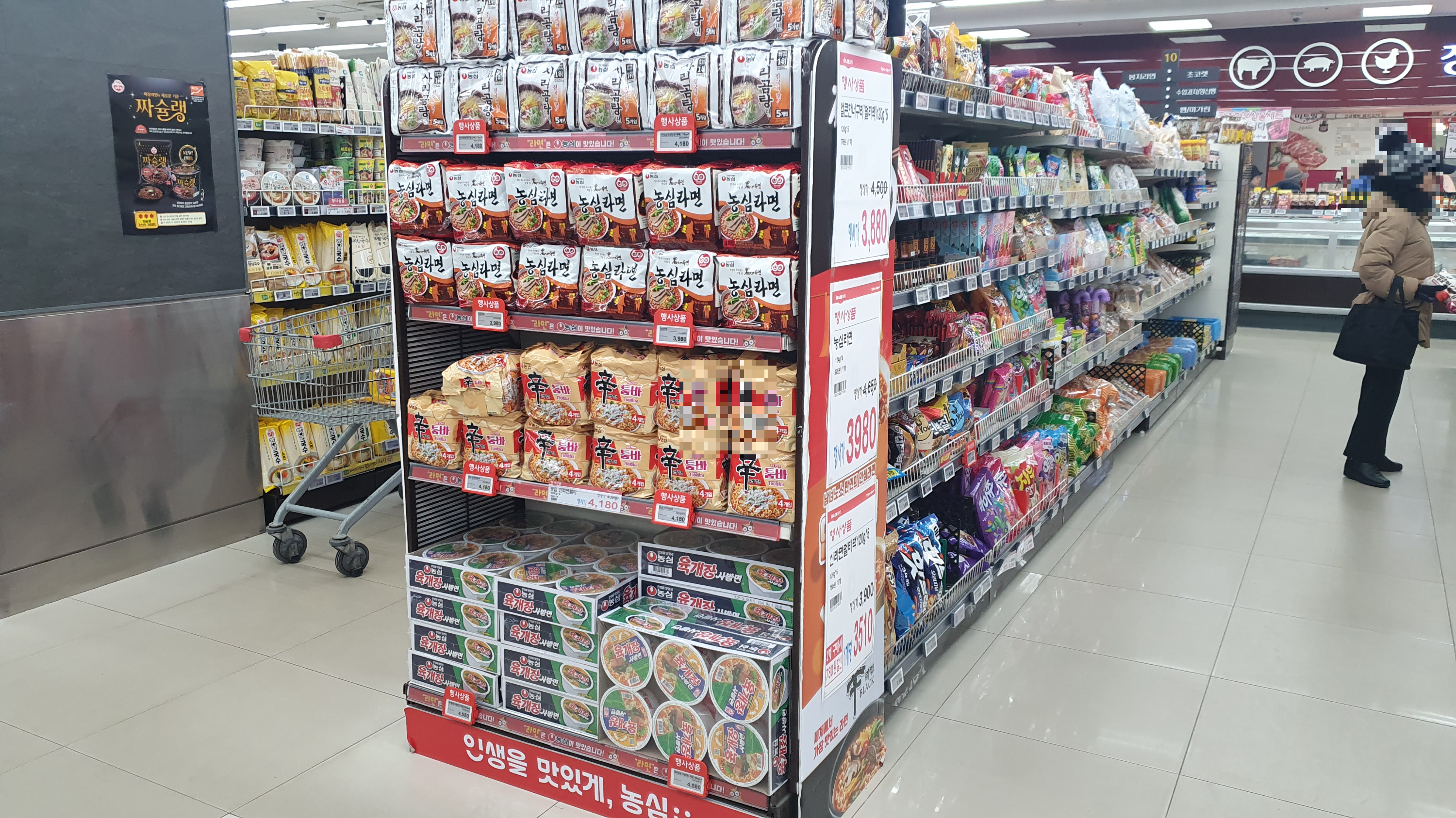 재고회전율을 높이기 위해 식품코너가 매우 넓었는데요. 요즘 인기 있는 라면과 과자류 역시 넓은 공간을 할애하였습니다. 이렇게 진열을 하면 장기채화 상품이 없기 때문에 상품관리에도 많은 도움이 될 수밖에 없습니다.