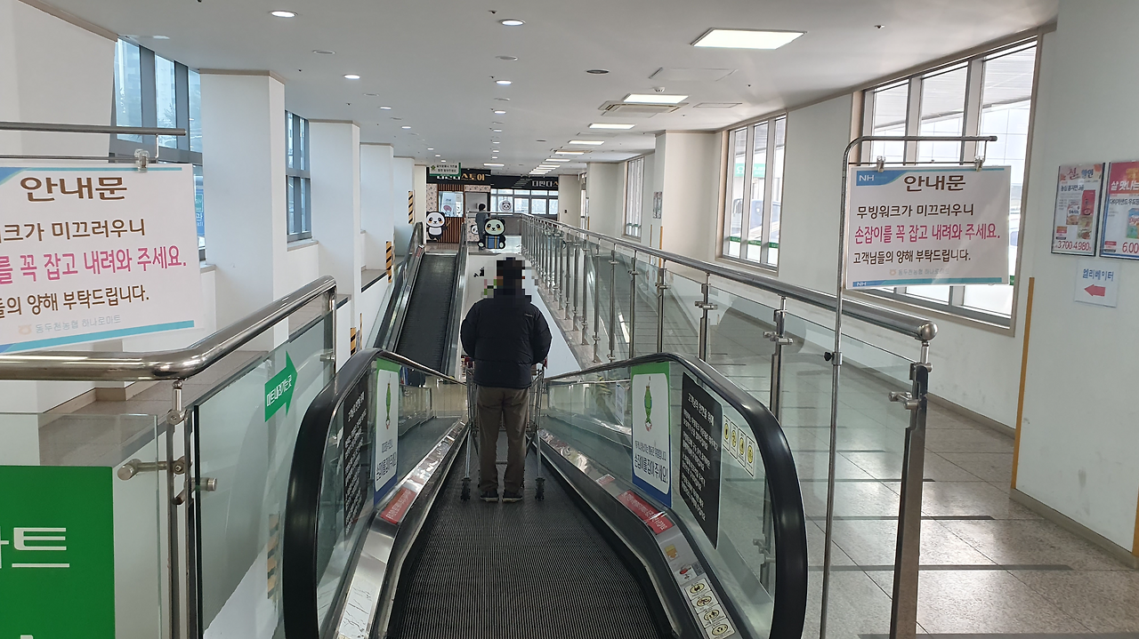 주차장은 2층에 마련되어 있었으며 2층에 주차를 하고 무빙워크를 타고 1층으로 내려오면 되는데요. 무빙워크 양 옆으로 다양한 할인 행사 POP로 인하여 다양한 쇼핑정보를 제공하고 있었습니다.