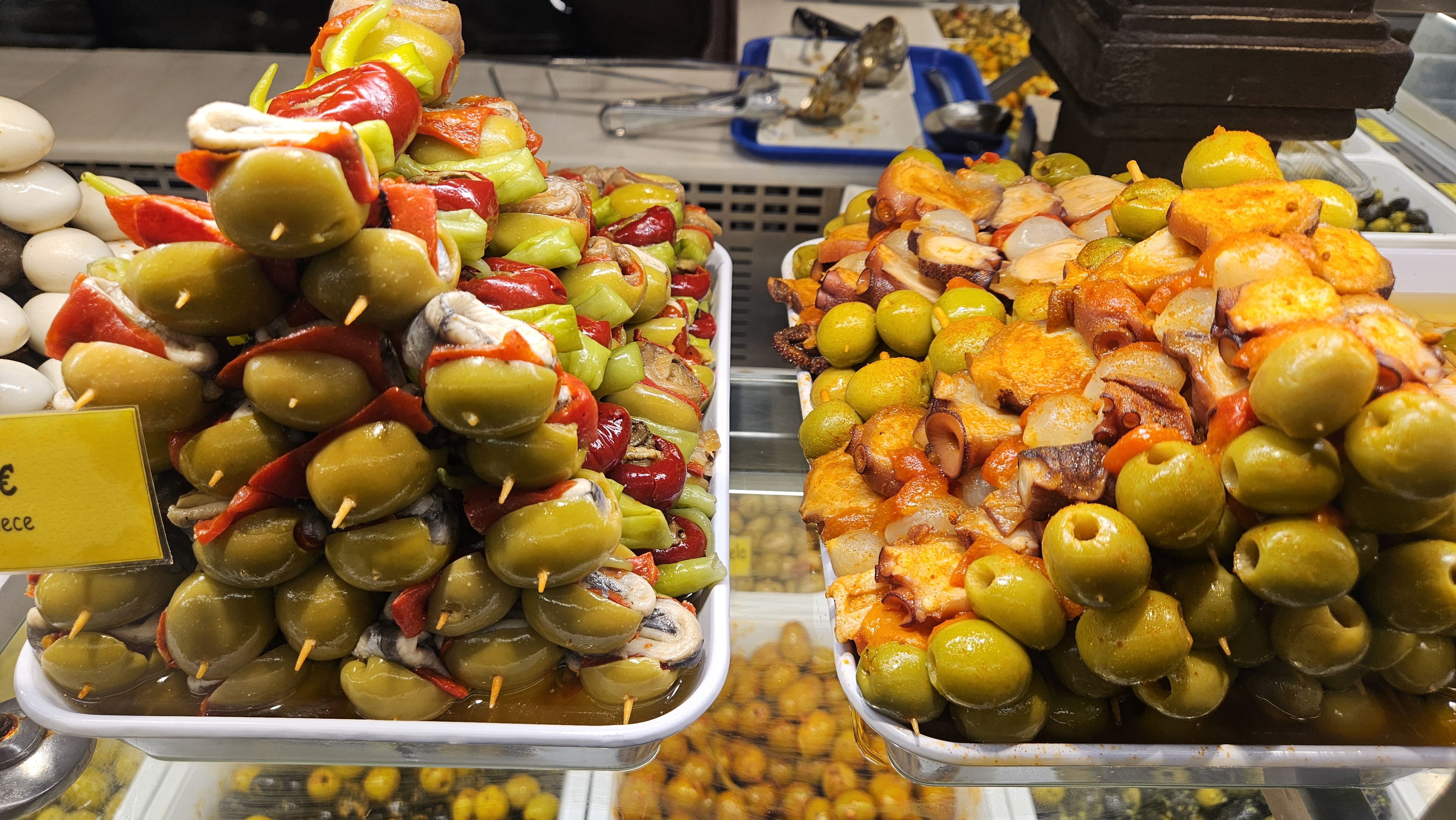 가장 인기 있는 메뉴는 단연 하몽 이베리코(Jamón Ibérico)와 타파스(Tapas)이다. 얇게 썬 하몽은 향과 풍미가 깊고, 올리브유에 절인 해산물 타파스는 신선도와 감칠맛이 뛰어나다. 또 다른 명물인 ‘크로케타(Croqueta)’와 ‘감바 알 아히요(Gambas al ajillo, 마늘 새우)’는 관광객들이 줄 서서 구매할 정도로 인기가 높다.