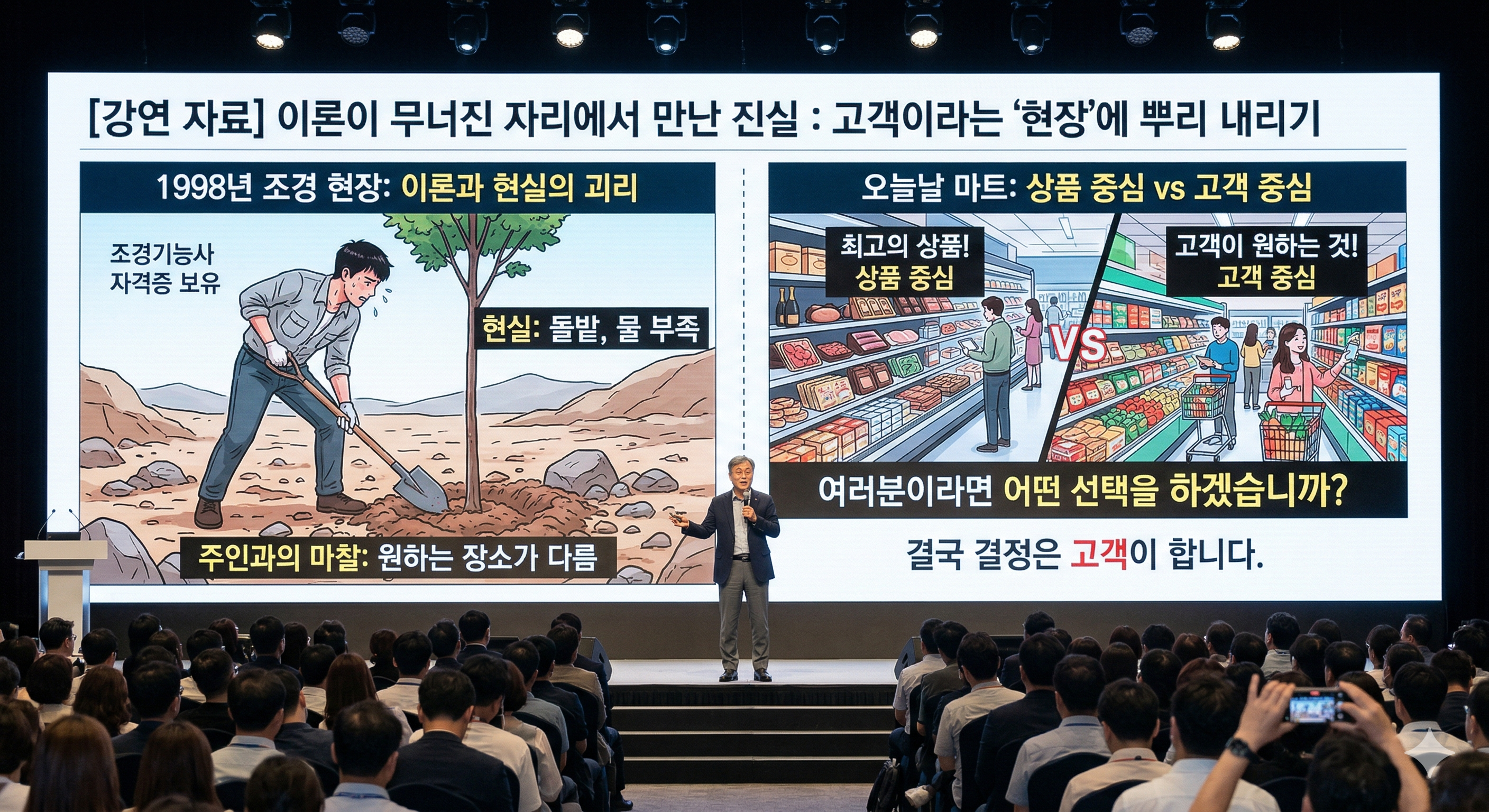 1998년, 돌밭에서 땀 흘리며 깨달은 것은 "나무는 땅을 이길 수 없다"는 것이었습니다. 오늘날의 마트 경영도 그렇습니다. 우리는 시장이라는 땅을, 고객이라는 환경을 이길 수 없습니다.